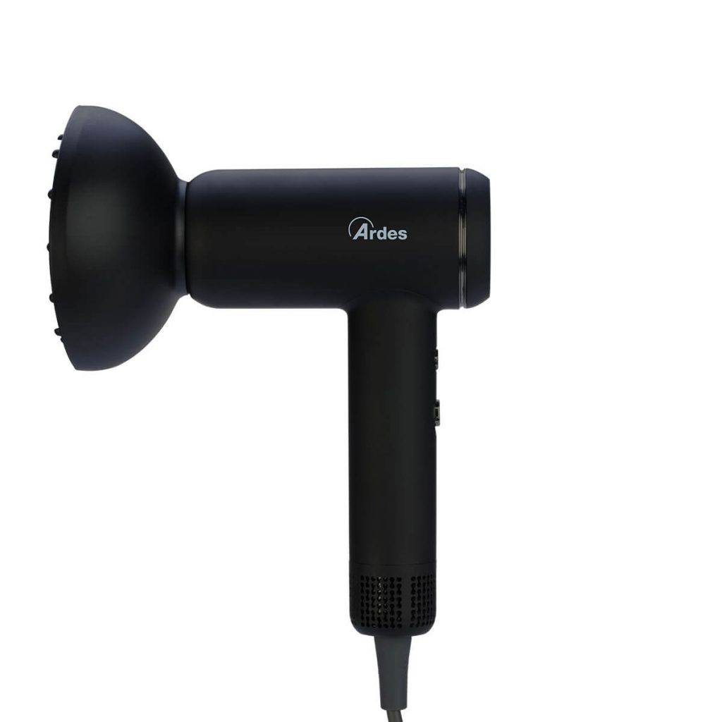 Asciugacapelli ad alta velocità con concentratore e diffusore. 2 velocità e 5 impostazioni di calore. Potenza max 1800W.
