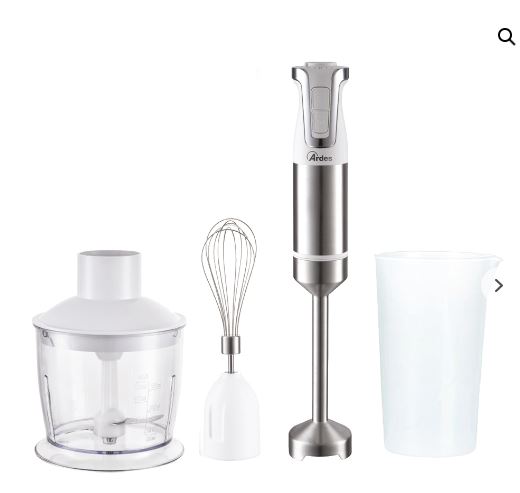 Set 3 in 1: frullatore ad immersione, frusta e tritatutto. Motore ad alta potenza da 1000W, 17400 giri al minuto. 2 modalità di funzionamento standard e turbo. Manopola per la regolazione elettronica della velocità. Impugnatura ergonomica. Frullatore ad immersione per creare vellutate cremose, salse o creme con 4 lame e gambo lungo 21 cm in acciaio INOX. Protezione tubolare antischizzo. Frusta in acciaio INOX per sbattere e montare. Tritatutto con lame in acciaio INOX da 600 ml per tritare e sminuzzare carne, frutta secca, formaggio o verdure di qualsiasi genere. Bicchiere graduato da 700 ml