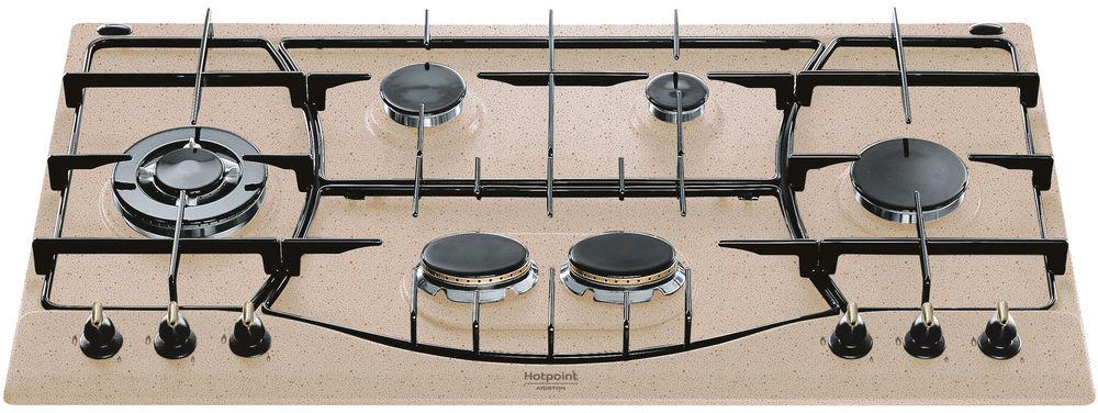piano cottura a gas a semifilo top 6 fuochi con sicurezza fuoco ultra rapido fuoco tripla corona accensione elettrica fuochi griglie in strip iron materiale piano sheetmetal comandi frontali colore avena peso netto 13,8 kg. larg. 87 alt. 3,3 prof. 51 cm.
