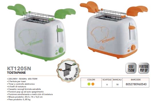 • 220-240V~ 50/60Hz 650-750W • 2 feritoie per toast • Timer a controllo elettronico • 6 livelli di tostatura • Cassetto raccogli briciole estraibile • Funzioni pop up ed auto spegnimento • Funzione annullamento a metà ciclo di tostatura • Misure prodotto: 25,5 x 14 x 16,5 cm • Peso prodotto: 0,.85 kg
