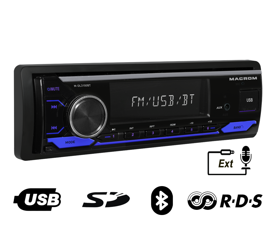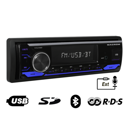 AUTORADIO MACROM 1DIN CON RADIO AM/FM-RDS, BLUETOOTH, INGRESSI USB E SD