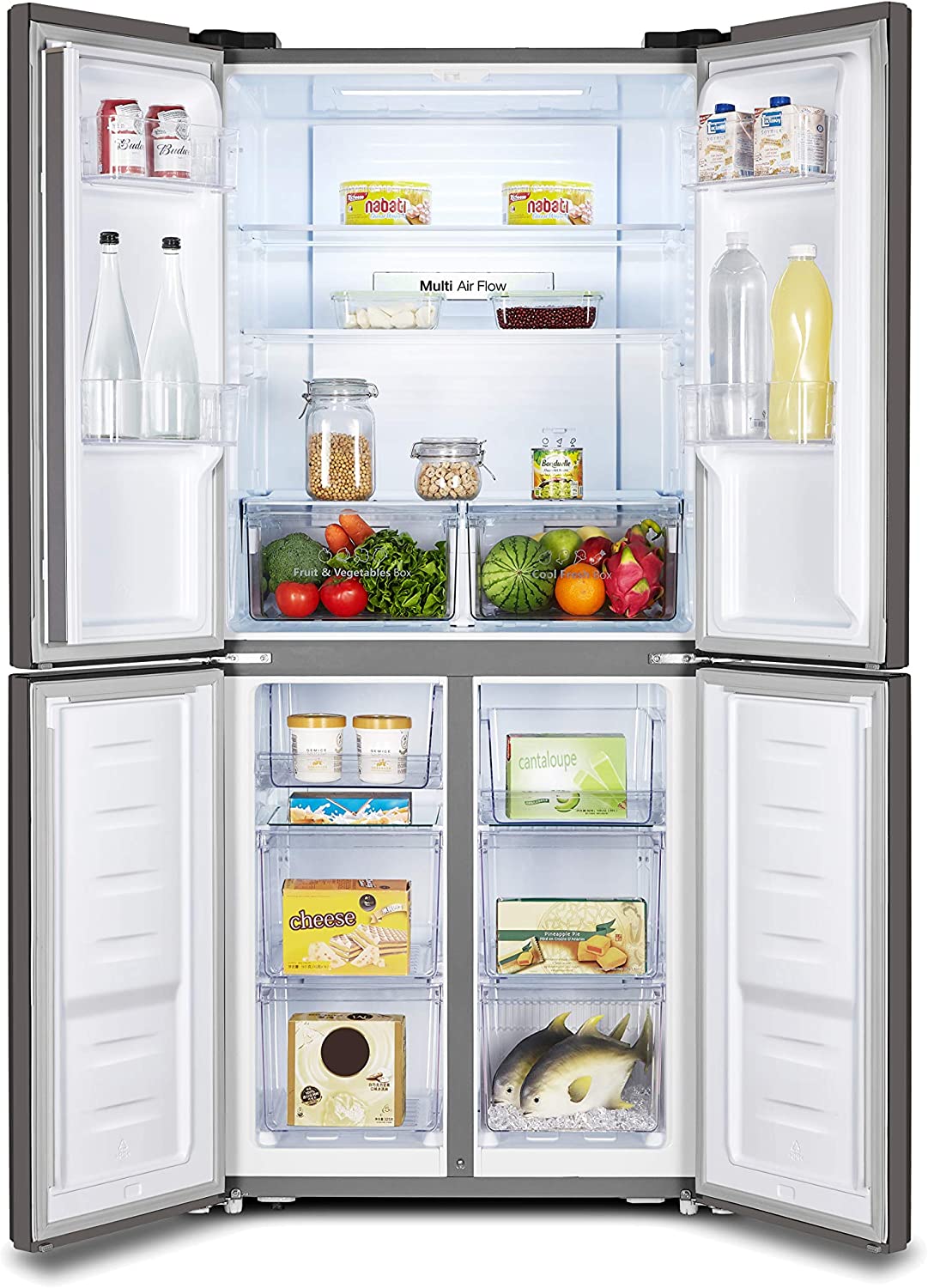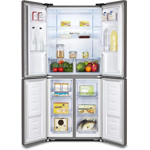 Hisense RQ515N4AC2 è un frigorifero a 4 porte con Capacità Netta Totale 394 lt, Capacità Netta frigorifero 265 lt, Capacità Netta freezer 129 lt, Classe Energetica E, Consumo energetico 394, Total No Frost, Raffreddamento rapido Congelamento rapido, Ripiani in vetro temperato