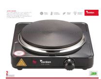 Potenza max 1500W 220-240V 50Hz; Dimensioni Ø190 mm; Piastra in ghisa; Termostato per la regolazione della potenza; Manopola per la regolazione della temperatura; 5 livelli di temperatura, indicatore luminoso