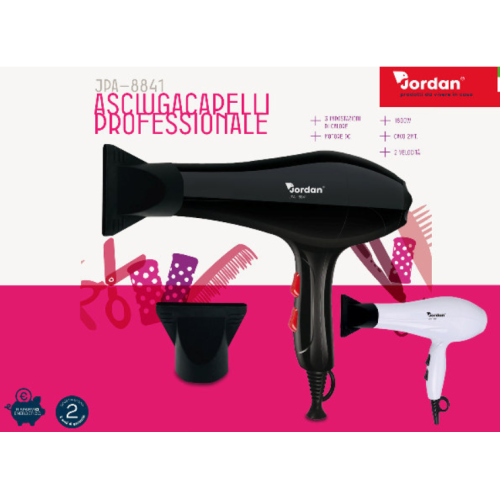 ASCIUGACAPELLI PROFESSIONALE JORDAN Potenza 1800W 220-240V 50Hz; 2 velocità; 3 impostazioni di riscaldamento. Filtro aria posteriore removibile per una facile pulizia. Passacavo con appendino. Motore DC. Cavo 2mt. - Spina VDE. Accessori: Concentratore. Colore : bianco e nero, confezione assortita.