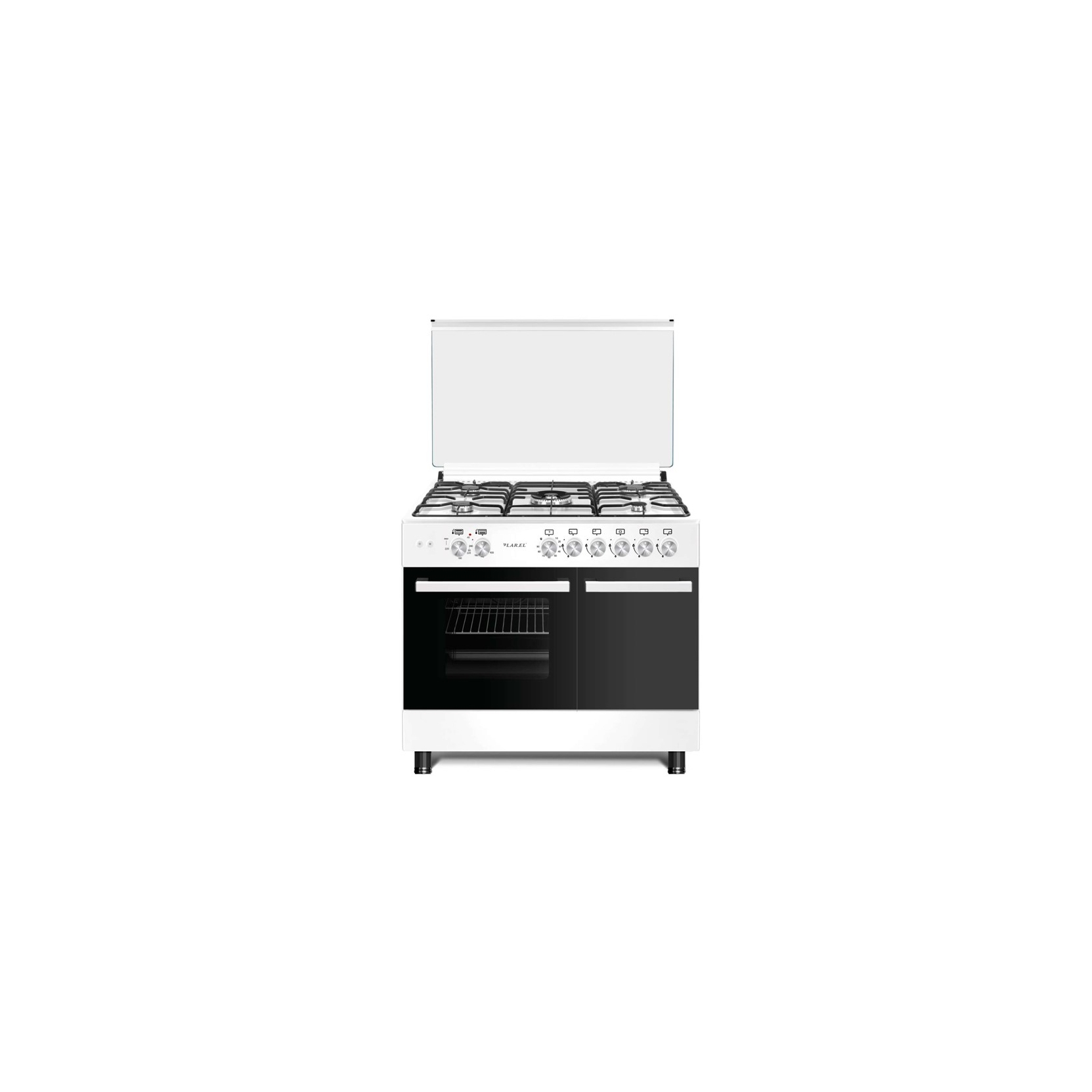 LAREL L90BT5EB. Cucina a gas 90x60 cm -Forno Elettrico Ventilato 6 funzioni - Grill Elettrico - Con Forno 72 Lt - Con Portabombola - 5 Fuochi a gas con Tripla corona centrale - Ventola tangenziale di raffreddamento - Coperchio in vetro con profilo alluminio - CON STOP GAS A CHIUSURA COPERCHIO - Timer meccanico - Luce forno - Accensione elettronica Termostato temperatura - Vetro interno removibile per pulizia - Piedi regolabili
