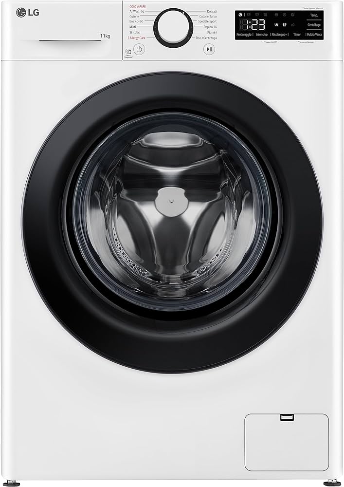 Lavatrice - Carica frontale - Libera installazione (FS) - Capacità 11 Kg - Centrifuga max 1400 Giri - Classe energetica A - 12 programmi - Con tasto partenza ritardata - AI Wash Allergy Care Speciale Sport Piumini - Risparmia più energia Abbiamo a cuore l'efficienza dei nostri elettrodomestici, in modo che possano pesare il meno possibile sulla tua bolletta dell'energia elettrica. Questa lavatrice ti offre un'efficienza elevatissima, perché è il 10% più efficiente rispetto a quelle tradizionali in classe A. Questa lavatrice ha la profondità standard di 56,6cm, ma ti permette di lavare fino a 11kg di bucato grazie al cestello interno di grandi dimensioni. Una vera comodità se hai bisogno di lavare tanti indumenti ma non hai spazio in casa per installare una lavatrice maxi. In questo modo potrai fare il bucato in meno cicli, risparmiando tempo ed energia. Tecnologia AI DD L'Intelligenza Artificiale della lavatrice non si limita a rilevare il peso dei vestiti nel cestello, ma identifica anche la tipologia dei tessuti in modo da scegliere autonomamente i movimenti ottimali per ogni lavaggio fra 20.000 combinazioni diverse. In questo modo i tuoi capi saranno trattati con una cura superiore del 18%, facendoli durare più a lungo. I risultati possono variare a seconda dei capi e dell’ambiente. Il lavaggio a vapore è utilissimo per igienizzare i tuoi capi, eliminando così germi, batteri e allergeni. Il vapore permette anche di distendere meglio le fibre in modo da migliorare l'efficacia del lavaggio. Cestello a bolle Il cestello di questa lavatrice ha la superficie ""a bolle"", una particolare conformazione che permette di salvaguardare i tessuti evitando l'eccessivo sfregamento col cestello durante il lavaggio e la centrifuga. Motore Inverter Direct Drive garantito 10 anni Il motore Inverter Direct Drive è un brevetto di LG e si differenzia dai motori tradizionali perché è collegato direttamente al cestello. Una soluzione molto più affidabile nel tempo - perché vengono eliminati componenti soggetti a usura come cinghia e puleggia - e che permette di gestire i movimenti del cestello con maggior precisione per migliorare l'efficacia del lavaggio. Programma Allergy Care Il programma dedicato Allergy Care è molto utile se in famiglia qualcuno soffre di problemi allergici. Grazie al lavaggio ad alte temperature, questo programma riduce del 99,9% gli acari della polvere responsabili di allergie o problemi respiratori. Il ciclo Allergy Care è stato approvato dalla BAF (British Allergy Foundation) proprio per la sua capacità di ridurre gli acari della polvere domestica del 99,9%. Agitatori in acciaio inox Gli agitatori in acciaio inox garantiscono la massima igiene nel cestello evitando la formazione di muffe e batteri. Rispetto ai normali agitatori in plastica, infatti, l'acciaio inox è un materiale più igienico, ideale per mantenere un ambiente più salubre all'interno del cestello.