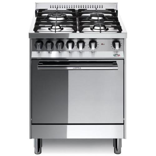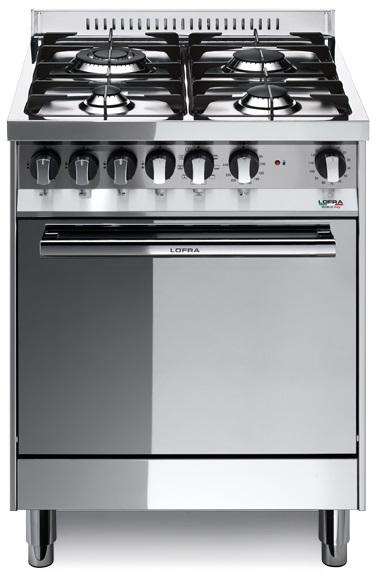 cucina a gas 4 fuochi con sicurezza accensione elettrica fuochi classe energetica "A" materiale piano acciaio inox fuoco tripla corona fuoco rapido forno elettrico ventilato 66 lt. forno 9 programmi termostato forno grill elettrico girarrosto tradizionale luce forno contaminuti vetro forno doppio griglie in ghisa piedini regolabili colore acciaio inox larg. 60 alt. 85 prof. 60 cm.