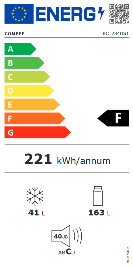 COMFEE' RCT284DS - RCT284DS1. Capacità netta totale: 204 L, Classe climatica: N-ST, Emissione acustica: 40 dB. Capacità netta frigorifero: 163 L, Luce interna, Numero di ripiani frigorifero: 4, Numero di cassetti per verdura: 1. Capacità netta congelatore: 41 L, Capacità di congelamento: 2 kg/24h. Classe efficienza energetica: F. (HxLxP) 143x55x55