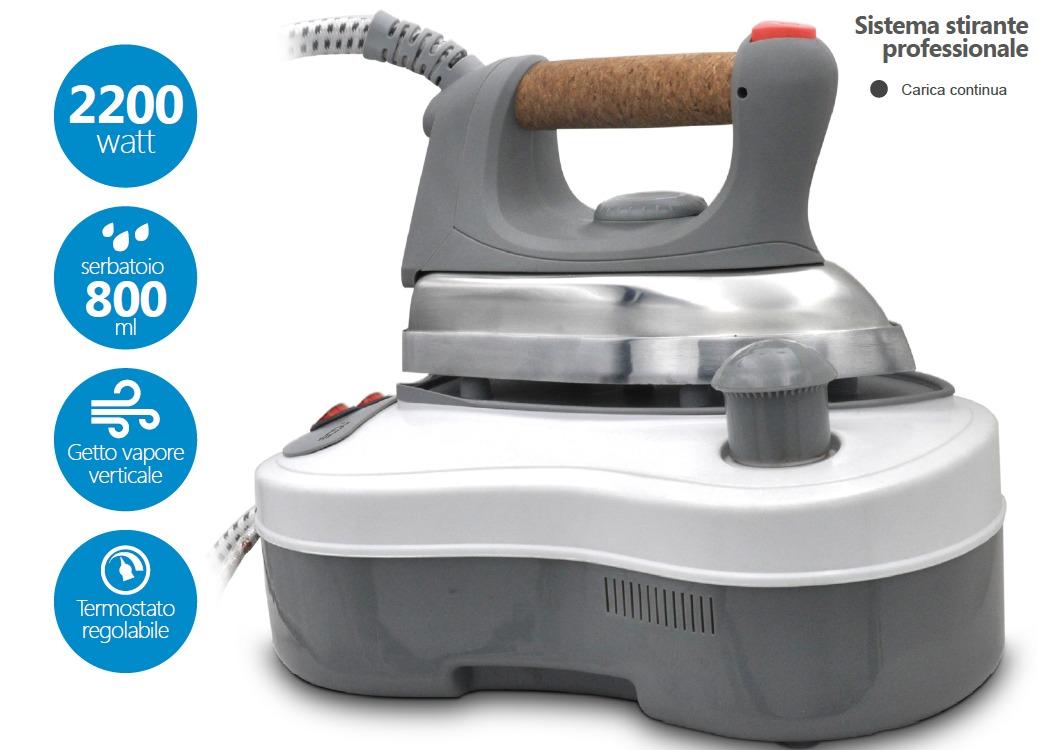 Tensione: 220-240 V • Frequenza: 50/60 Hz • Potenza totale: 2000 W • Potenza della caldaia: 1200 W • Potenza del ferro da stiro: 800 W • Lunghezza del cavo elettrico: 1.8 m • Lunghezza del tubo vapore: 1.8 m • Pressione del vapore: 3.5 bar • Output vapore: 65-75 g/min • Capacità del serbatoio: 700 ml • Placca di metallo: Alluminio • Caldaia: Acciaio inossidabile