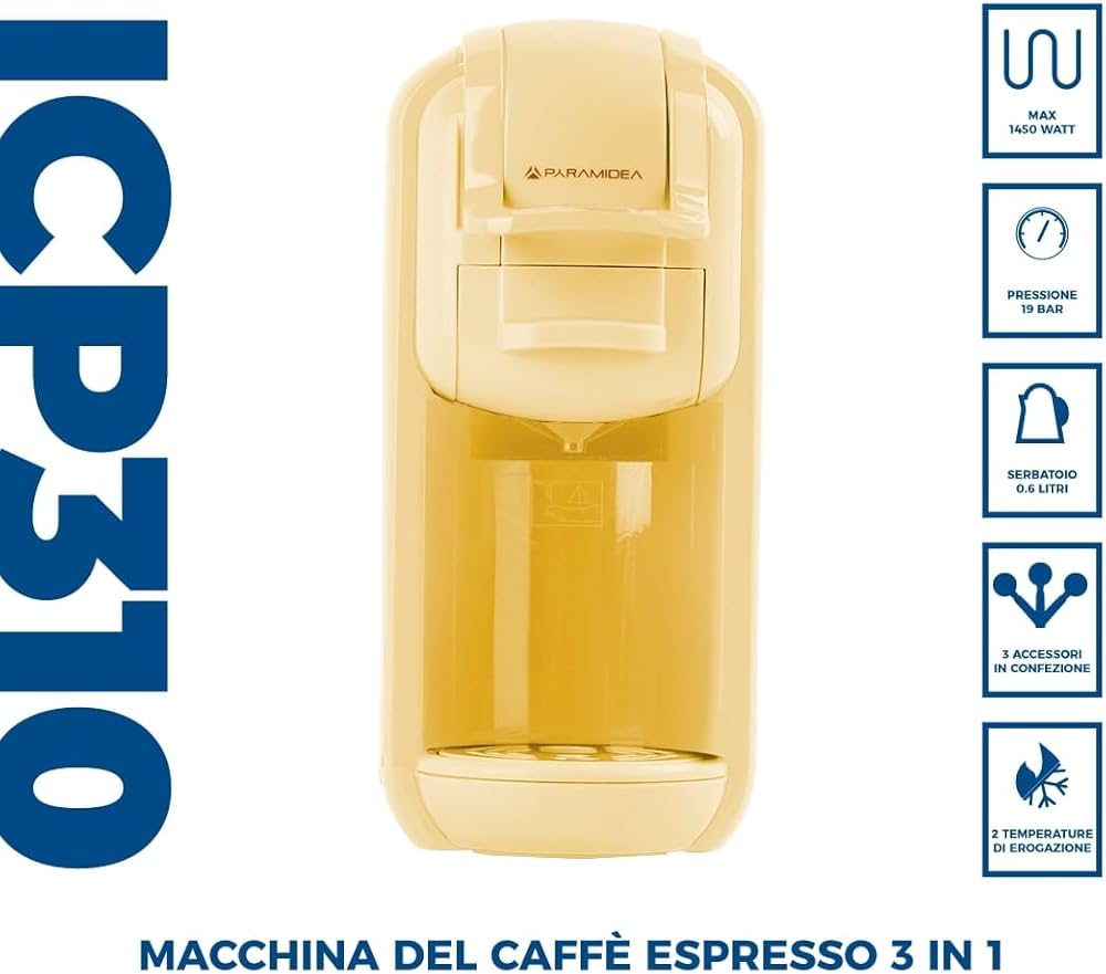 PYRAMIDEA Macchina per Caffè 3 in 1 Compatibile Nespresso Dolcegusto e Cialde Bevande Fredde da 0,6L Crema ICP310C