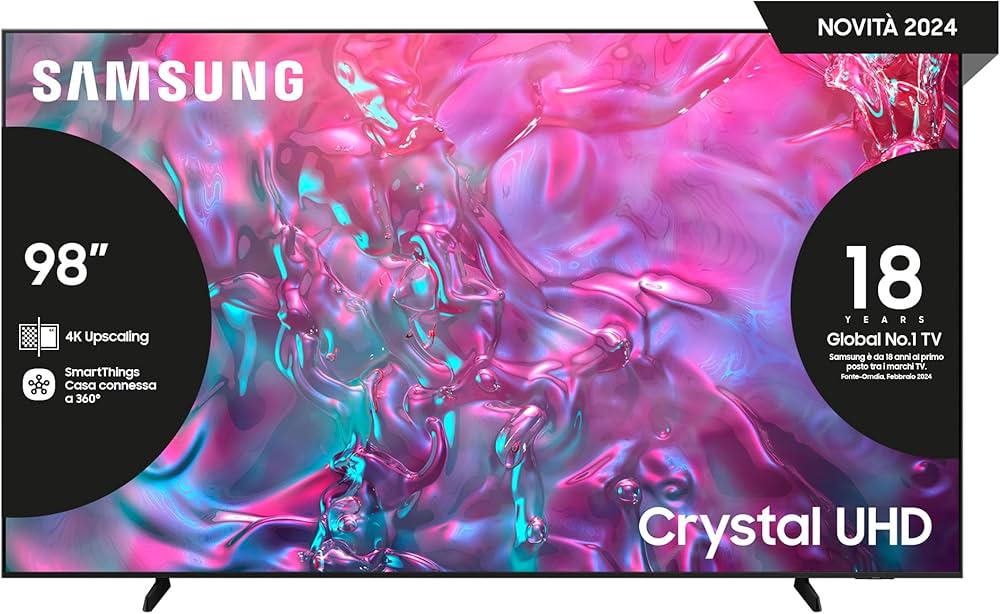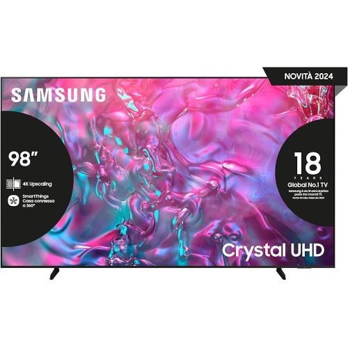 Samsung TV Crystal UHD 4K 98” UE98DU9070UXZT Smart TV Wi-Fi Graphite Black 2024, Processore Crystal 4K, 4K Upscaling, Slim Look, OTS Lite. Dimensioni diagonale schermo: 2,49 m (98"), Risoluzione del display: 3840 x 2160 Pixel, Tipologia HD: 4K Ultra HD, Tecnologia display: LED, Forma dello schermo: Piatto. Smart TV. Tecnologia di interpolazione del movimento: Motion Xcelerator. Formato del segnale digitale: DVB-C, DVB-S2, DVB-T2. Wi-Fi, Collegamento ethernet LAN. Colore del prodotto: Nero