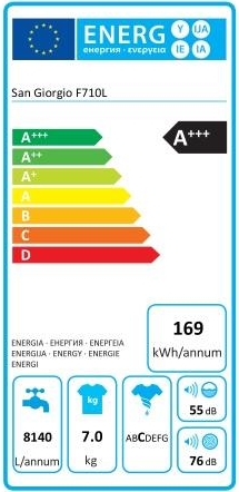 Dati tecnici Tipologia del prodotto : Libera installazione Capacità di carico: 7 kg Velocità massima di centrifuga : 1000 giri al minuto Codice EAN : 8033675151694 Dimensioni del prodotto : 842 x 450 x 596 mm Dimensioni con imballo : 880 x 515 x 634 mm Peso Netto : 67 kg Peso Lordo : 68 kg Volume cesto (litri) : 48 lt Diametro cesto : 470 mm Piedini regolabili: Si Oblò: Tipo 7 Angolo apertura porta : 180 ° Diametro oblò : 470 mm Dati nominali collegamento elettrico: 2200 W Corrente : 10 A Tensione : 220 - 240 V Frequenza : 50 Hz Certificazione omologazione : VDE Efficienza energetica* : D Efficienza centrifuga* : B Consumo di energia ponderata* : 65 kWh/annuo Indice efficienza lavaggio* : 1,031 Consumo d’acqua per ciclo* : 33 lt Consumo energetico per ciclo* : 0,653 kWh Classe rumore* : C Emissione rumore in fase di centrifuga* : 76 dBA Programma a tempo ponderato* : 205 min Pannello di controllo - Indicatori LED - Indicatore avanzamento programma Sicurezza - Sicurezza bambini - Antitrabocco - Antischiuma - Controllo surriscaldamento