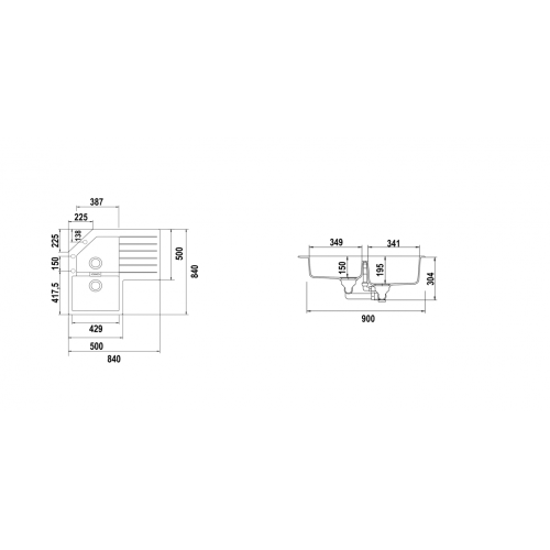 DIMENSIONI: 840x840x500 BASE 900 FORO incasso Vedi scheda tecnica Vasche 349x387x150 / 341x429x195 Orientamento Vasche SX