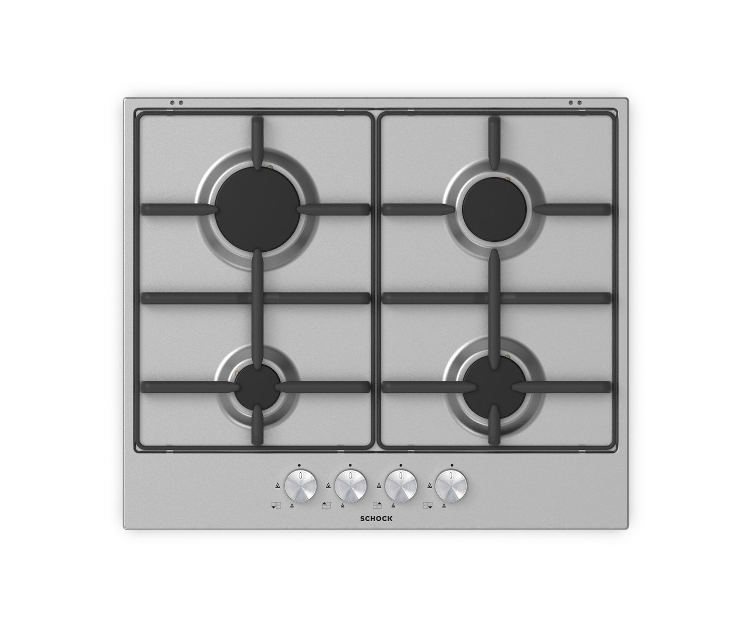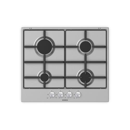 Il piano cottura a gas Schock Silver PC60 AV finitura inox è dotato di 4 fuochi, manopole milleluci, accensione sottomanopola e griglie in piattina finitura ghisa con superficie maggiorata.