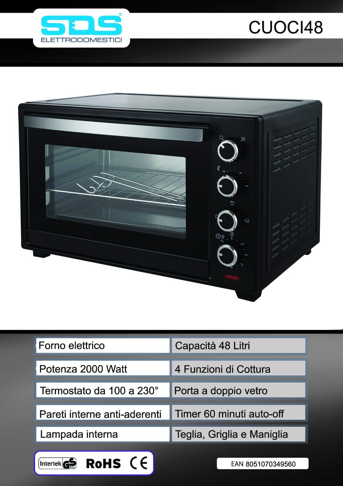 SDS FORNO ELETTRICO 48LT 2000W 4FUNZ COTTURA PARETI ANTIADERENTI