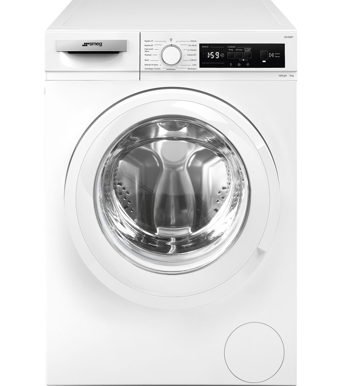 Lavatrice SMEG 8 kg, Classe energetica D, Profondità 55,7 cm, Velocità di Centrifuga 1000 giri, Lavaggio a mano, Programma lana, Programma eco, Lavaggio rapido; Programmi: Eco 40-60 Colorati Rapido 60' Lavaggio a mano/Delicati Piumoni Cotone Jeans/Capi scuri Cotone Prelavaggio Cotone 20° Risciacquo Scarico + Centrifuga Lana Sport Antiallergico Rapido 15 min, Alt. 85,5 cm, Larg. 59,7 cm, Prof. 55,7 cm