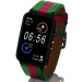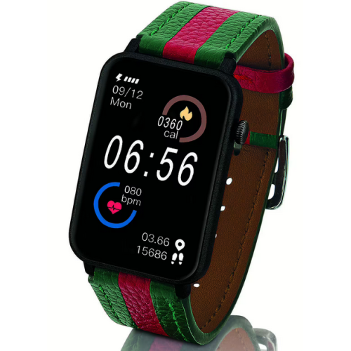 Smartwatch da uomo di TecnoChic della collezione tc-l17. La cassa è di colore nera. Il primo cinturino è realizzato in eco pelle verde con riga rossa, il secondo in silicone nero. Le funzioni sono: monitoraggio accurato temperatura corporea, battito cardiaco, pressione e ossigenazione sanguigna, monitoraggio step giornalieri, analisi riposo notturno, notifiche chiamate e social, sveglia, avviso sedentarietà, registrazione sessioni allenamento. La referenza è tc-l17-01