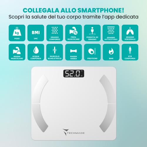 | Altre funzioni | Registrazione profilo, Controllo salute del corpo in App (massa ossea, acqua corporea, massa muscolare, peso BMI, grasso corporeo, ecc.) |