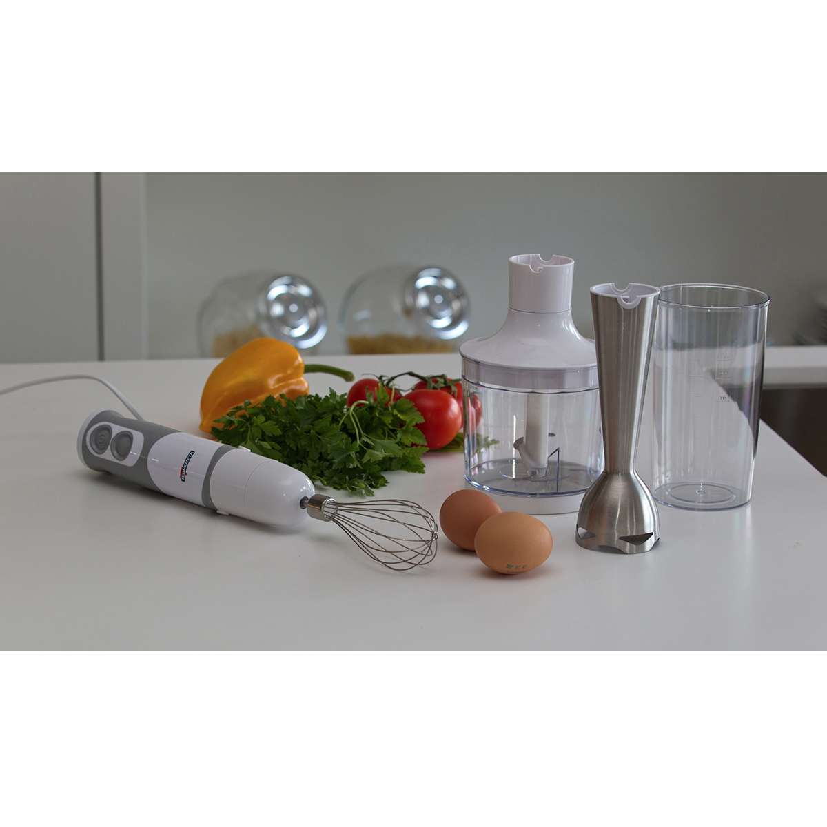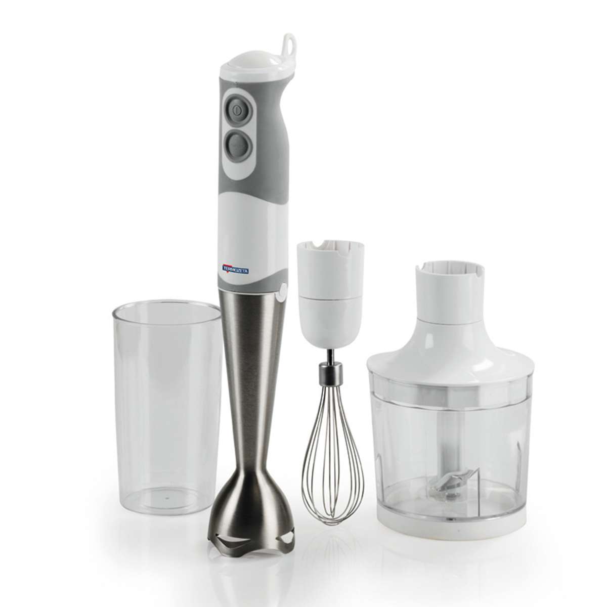 - Frullatore a immersione con accessorio sbattitore: una frusta in acciaio inox ideale per sbattere, montare e miscelare.