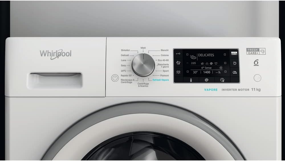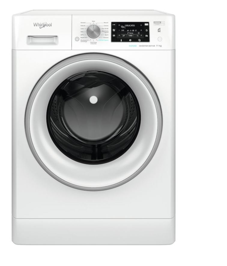 LAVATRICE WHIRLPOOL Caricamento frontale. Capacità cestello: 11 kg, Classe di efficienza della centrifuga: B, Silenziosità (centrifuga): 76 dB, Velocità di centrifuga massima: 1400 Giri/min. Colore del prodotto: Bianco. Larghezza: 595 mm, Profondità: 605 mm, Altezza: 850 mm. Classe efficienza energetica: A, Tipo di carica: Caricamento frontale. Capacità cestello: 11 kg, Classe di efficienza della centrifuga: B, Silenziosità (centrifuga): 76 dB, Velocità di centrifuga massima: 1400 Giri/min. 16 Programmi. Funzioni speciali: