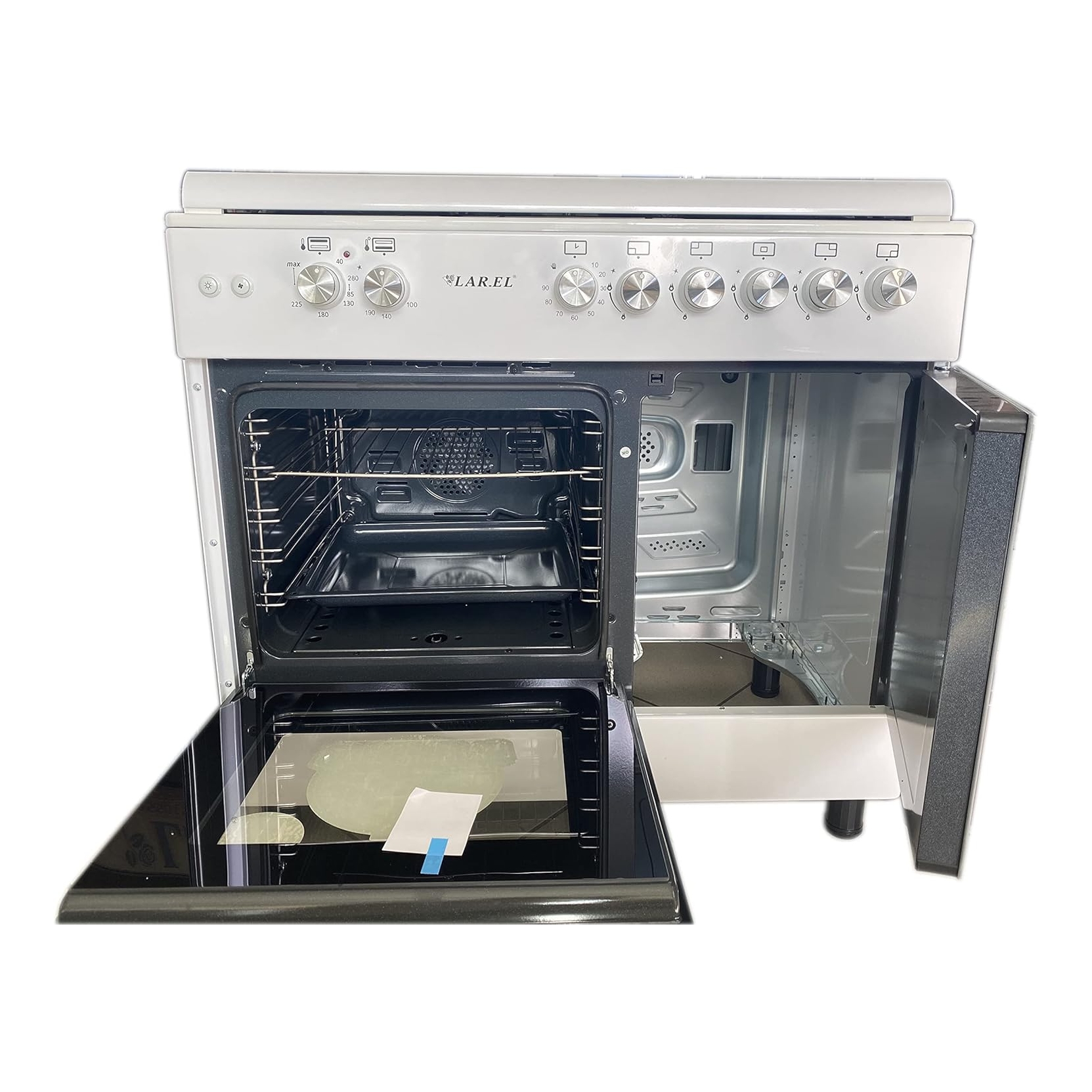 LAREL L90BT5EB. Cucina a gas 90x60 cm -Forno Elettrico Ventilato 6 funzioni - Grill Elettrico - Con Forno 72 Lt - Con Portabombola - 5 Fuochi a gas con Tripla corona centrale - Ventola tangenziale di raffreddamento - Coperchio in vetro con profilo alluminio - CON STOP GAS A CHIUSURA COPERCHIO - Timer meccanico - Luce forno - Accensione elettronica Termostato temperatura - Vetro interno removibile per pulizia - Piedi regolabili