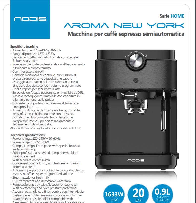 Alimentazione: 220-240V~ 50-60Hz • Range di potenza: 1372-1633W • Design compatto. Pannello frontale con speciale finitura spazzolata • Pompa a solenoide professionale da 20bar, elemento riscaldante a blocco termico • Con interruttore on/off • Comoda manopola di controllo, con funzioni di preparazione del caffè e produzione vapore • Dosaggio automatico del caffè espresso in tazza singola o doppia secondo il volume programmato • Ugello vapore per schiumare il latte • Serbatoio dell'acqua trasparente e rimovibile da 0.9L • Vassoio raccogligocce rimovibile con copertura in alluminio per una facile pulizia • Con sistema di protezione da surriscaldamento e sovrapressione • Accessori: filtri caffè da 1 tazza e 2 tazze, portafiltro pressofuso, cucchiaino da caffè con pressino, portafiltro e filtro compatibile con le capsule Nespresso® con cui preparare rapidamente e facilmente un delizioso caffè